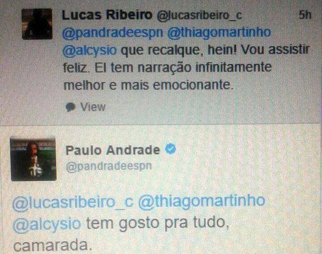 ATUALIZAÇÃO: O narrador André Henning, do Esporte Interativo, também se pronunciou no Twitter rebatendo o termo ‘tem gosto pra tudo’ usado por Paulo Andrade. “E que coisa feia não saber perder. Isso faz parte da vida! O ‘tem gosto para tudo’ é de uma baixeza, mas não me surpreende”, escreveu, mas depois apagou o post.